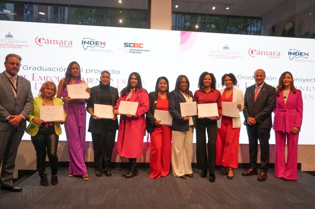 Madrid, España. – En el marco de la Semana Dominicana en España (SEDE 2025), celebrada recientemente en la ciudad de Madrid, la Dirección de Desarrollo Social Supérate graduó la primera cohorte de 15 egresadas del programa Mujeres SuperEmprendedoras, quienes gracias a su esfuerzo y dedicación han logrado consolidar iniciativas productivas que contribuyen al desarrollo económico de comunidades y al bienestar de sus familias.